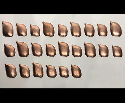 Remaking Tao Te Ching VIII (detail) Hammered copper, installation, dimensions variable (99 elements, size ranges from 3.5” to 5.5” high, 0.5” deep)